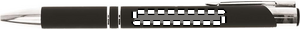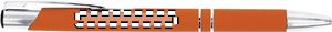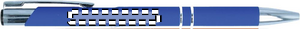 Kulepenn med trykknapp og blått blekk. I graveringen er logoen farget metall, men litt mattere enn detaljene på pennen.