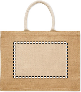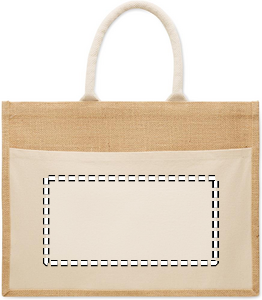 Kasse av laminerad jute och 280 gr/m² bomullscanvas med handtag av rep. Innehåller stor öppen ficka framtill.