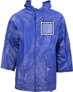 Regnjakke med hette i PVC. Trykknappknapping.