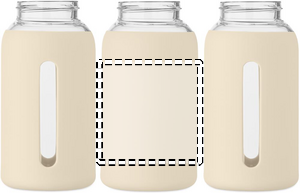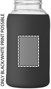 Flaska i borosilikatglas med silikonpåse och PP-lock med handtag. Volym: 600 ml
