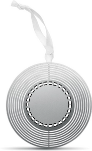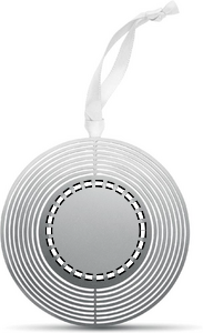 Circular shaped decorative ornament in stainless steel with ribbon in gift envelope. Easily folds flat for mailing and storage.