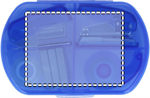 Skrivebordssett med tape dispenser, mini stiftemaskin med 300 stifter, mini hullemaskin, og en taperull. Leveres i en kompakt gjennomsiktig plasteske.