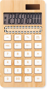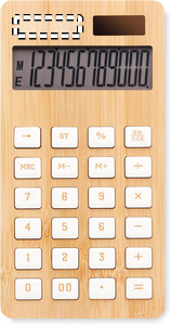 Bambus kalkulator med 12 sifre. Drevet av solcelle og batteri. Matriell bambus og ABS. 1 cellebatteri inkludert.