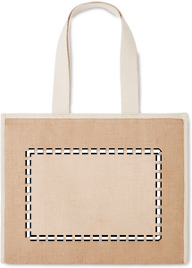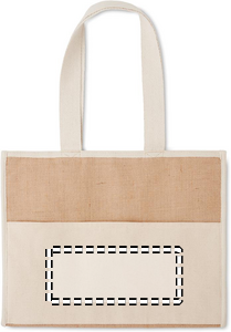 Jutekasse med långa handtag och kardborre stängning. Ficka på framsida i canvas och bomullsband. Denna produkt är certifierad enligt OEKO-TEX® STANDARD 100.