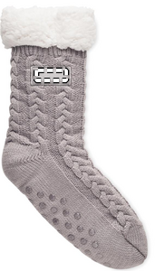 Pair of cable knit slipper socks with non-slip grippers on the bottom in Acrylic twine and 240 gr/m² faux sherpa lining. Presented in paper tube giftbox. Size M= 36-39. These comfortable socks will keep your feet warm and prevent you from slipping thanks to the anti-slip on the bottom. Perfect to wear indoors during the cold winter months. They come in a gift box, making them the perfect gift for the Holidays.