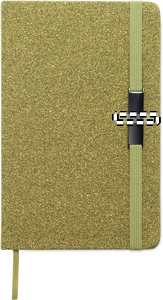 Set med A5 anteckningsbok med hårt omslag och 160 linjerade sidor av återvunnet papper (80 ark/70 gsm), metallpenna med vridfunktion och nyckelring. Detalj tillverkad av 20% tesump, 30% kork, 50% polycottonväv. Metalldetalj på elastisk rem. FSC®-certified | FSC MIX CREDIT, N7.1, FSC-C213206