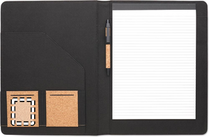 A4 konferensmapp i kork. Påfyllningsbart A4-anteckningsblock. 30 linjerade ark av återvunnet papper. Matchande penna och pennhållare. 2 korthållare och ett stort fack.