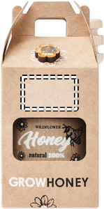 Wildflower honey jar (50g) with a wooden honey dipper. Gift someone this jar of delicious fresh wildflower honey. It includes honey bee flower seeds, so you can grow your own flowers in the garden that will attract bees. Comes in a kraft paper box. Made in EU.