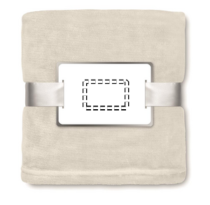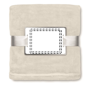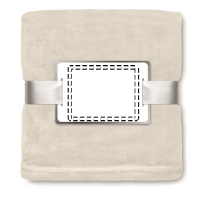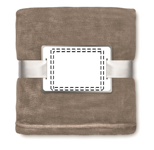Fleecepledd innpakket i pent bånd med kort til trykk.