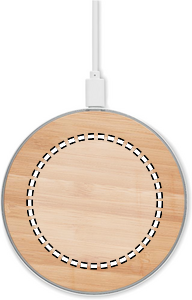 Trådløs hurtiglader i bambus og aluminium. Blått lys tennes når det lades. Utgang: DC9V/1.1A (10W). Bambus er et naturlig materiale, og det kan være små variasjoner i farge og størrelse, noe som kan påvirke merkingen.