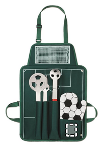Grillforkle med tre grillredskap og grillvott. Forkle i 600D polyester.