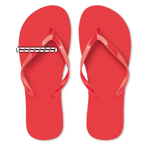 Strandtøfler i såle av polyetylen med pvc-stropp. Flip flop-tøffelen er tilgjengelig i 2 størrelser. M 36-39 og L 40-43.