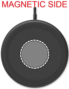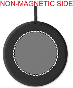 Magnetic wireless charger in ABS. Output: DC 9V/1.1A (10W) for quick charging. Compatible with iPhone® 12 and newer. Including additional magnetic metal ring to support charging of other non-magnetic wireless chargeable phones.