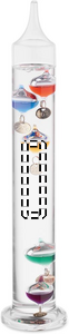 Galileo termometer i glas med fem färgade, flytande glober. Varje glob indikerar temperaturen från 18°c till 26°: Röd 26°, kunglig blå 24°, orange 22°, grön 20° och lila - 18°. Den lägsta globen i den översta gruppen anger omgivningstemperaturen.