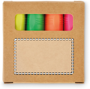 Set med 4 överstrykningspennor i en kraftlåda. Färgerna gul, grön, orange och cerise.