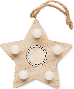 Wood (80% poplar wood and 20% weed wood) decorated star with 5 LED light and hanging cord. Including 1 CR2032 battery. Wood is a natural product, there may be slight variations in colour and size per item, which can affect the final decoration outcome.