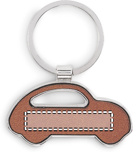 Bilformad nyckelring i metall med inlägg av återvunnet PU-läder.