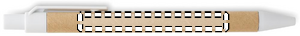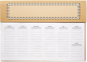 Veckoplanerare för skrivbordet (mån-sön) med omslag i kraftpapper, penna i kartong med blått bläck, trälinjal och anteckningsblock med självhäftande lappar.