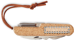 Stainless steel multi-function pocket knife with a cork cover and PU cord. 7 functions. It includes 2 openers, knife, scissor, screwdriver with Philips tips, file and wine opener. Cork is a natural product, there may be slight variations in colour and size per item, which can affect the final decoration outcome.