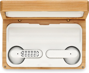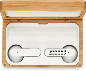 Trådlösa TWS-hörlurar med mikrofon i bambufodral. Inkluderar en 1200 mAh powerbank för nödsituationer med typ C-ingång och typ C-utgång. Automatisk parning.