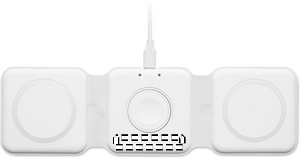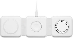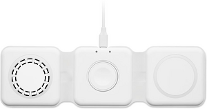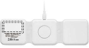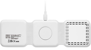 3 i 1 hopfällbar laddningsstation i ABS. Den har 3 trådlösa laddningspunkter. Ingång: 2-i-1 typ-C och typ-A.