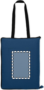 Vikbar quiltad picknickfilt med plastbelagd PEVA på baksidan. Fälls ihop till en praktisk bärväska och har en justerbar axelrem. Väskan har en stor sidoficka på framsidan.
