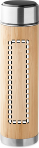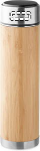 Double wall stainless steel/bamboo insulating vacuum flask with tea infuser inside. Includes LED touch thermometer in the lid. 1 replaceable CR2032 battery included. Capacity: 480 ml. Leak free.