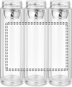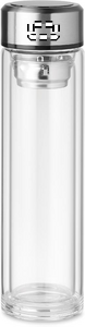 Glassflaske med dobbel vegg i boroisilikatglass. Borosilikatglass tåler store temperaturforskjeller uten å sprekke og er godt egnet for både varme og kalde drikker. leveres med LED-berøringstermometer innfelt i lokket for å se temperaturen på innsiden. Drevet av et 1 CR2032 batteri, inkludert. Lekke bevis. Volum: 390 ml. Lekkasjefri.