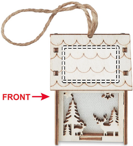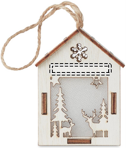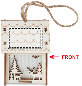 MDF decorated house with light inside with Christmas ornaments and hanging cord. Including 3 AG10 batteries.