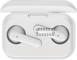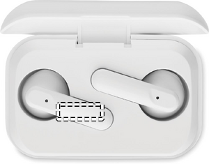 ABS True Wireless Stereo (TWS) 5.3 wireless stereo earbuds with microphone and 30 mAh battery. Playing time approx. 3 hours. It has a charge level LCD display. Auto-pairing. Including a Type C charging cable and a 250 mAh charging station.