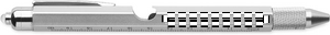 Twist action spirit level pen in stainless steel with ruler, stylus and Phillips head and flat head screw driver bits and LED. 3 AG batteries included. Blue ink.