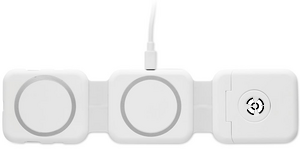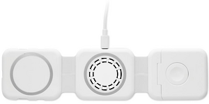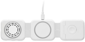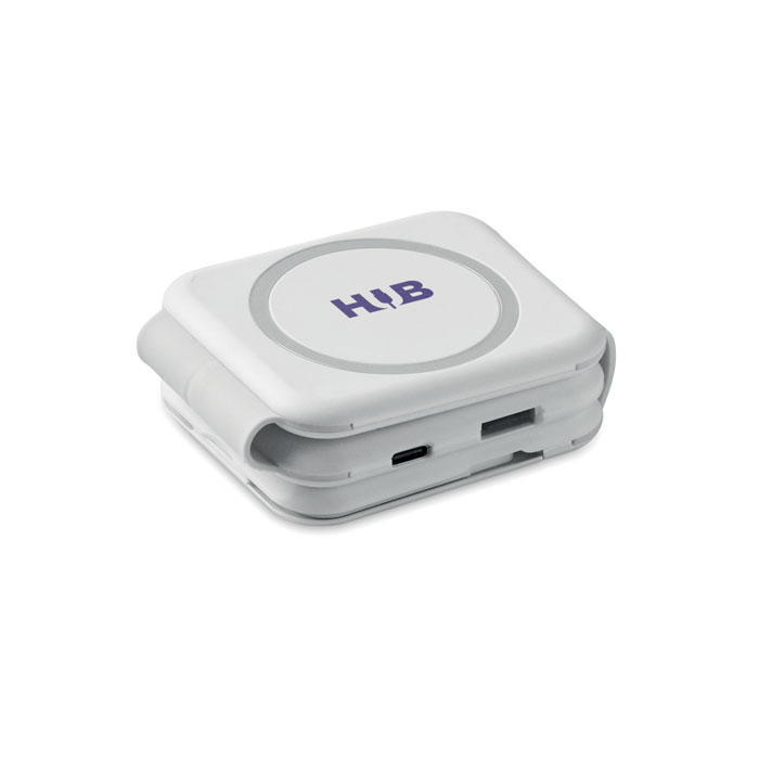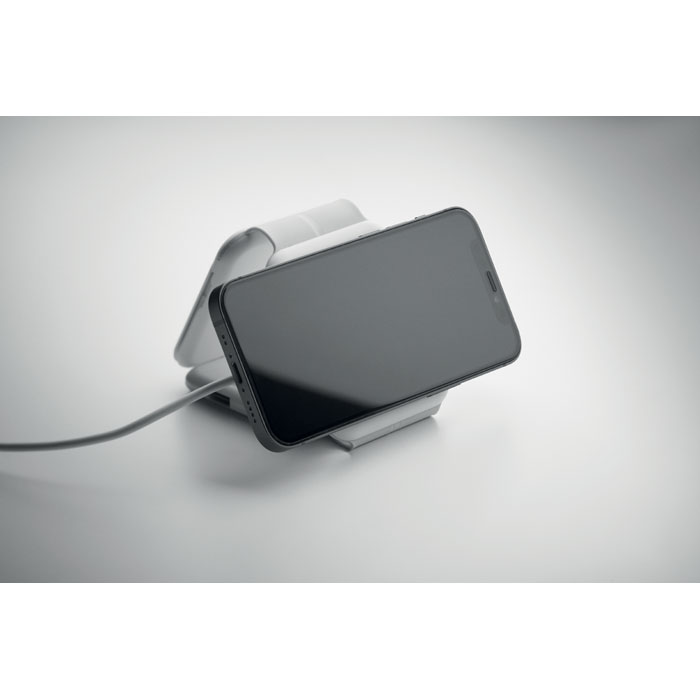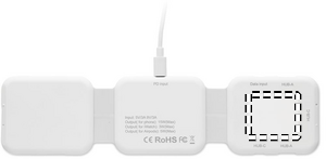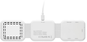 Magnetisk laddningsstation i ABS. 3 platser för trådlös laddning. 1 x 15W, 1 x 5W för TWS och 1 Apple watch-laddare (3W). 2 Typ-C & 2 USB-A HUBS. Integrerad kabelingång: kontakt från typ C till USB-A.