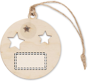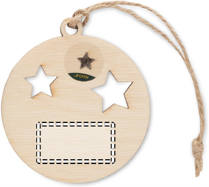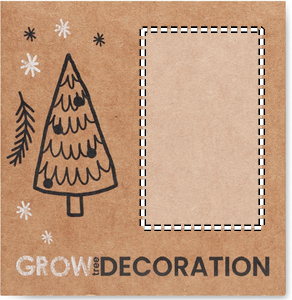 Julgransprynad i form av en träkula med jutesnöre och granfrön. Presenteras i kraftkuvert.
