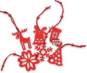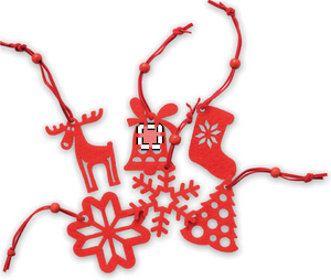 Set of 6 red felt tree hangers in 6 different designs: tree, snowflake, bell, boot, poinsettia and reindeer.