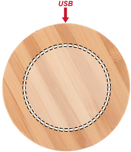 Desktop trådløs lader i bambus. Kobles til USB-port på datamaskin eller annen lader med USB-kontakt. Lad deretter telefonen ved å plassere den på nettbrettet. Lyser blått under lading.
