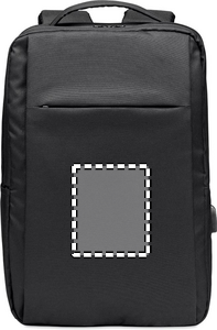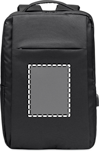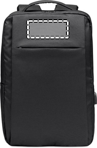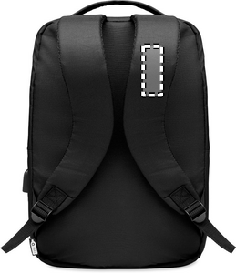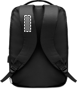 Computer backpack in 300D RPET Polyester with padded shoulder strap including one main internal compartment for 16 inch laptop and a USB charging cable.
