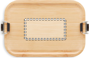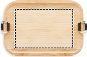 Stainless steel lunch box with side closure buckles and bamboo lid. Capacity: 750 ml.