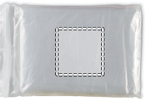 Sammenleggbar regnponcho med hette i polyetylenmateriale, pakket i en gjennomsiktig plastpose.