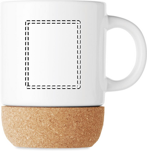 Ceramic mug with special coating for sublimation print and cork base detail. Individual packing in white carton box. Capacity: 300 ml