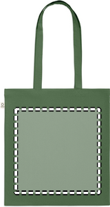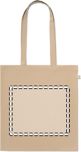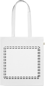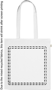 Kasse av återvunnen bomull (70% återvunnen bomull och 30% RPET) med långa handtag. 140 gr/m². Fra etbærekraftperspektiv er dette materialet veldig gunstig.