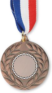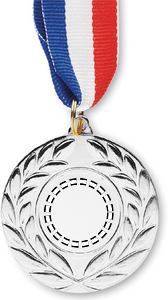 Medalj av järn med polyesterband i färgerna blått, vitt och rött. 5 cm i diameter